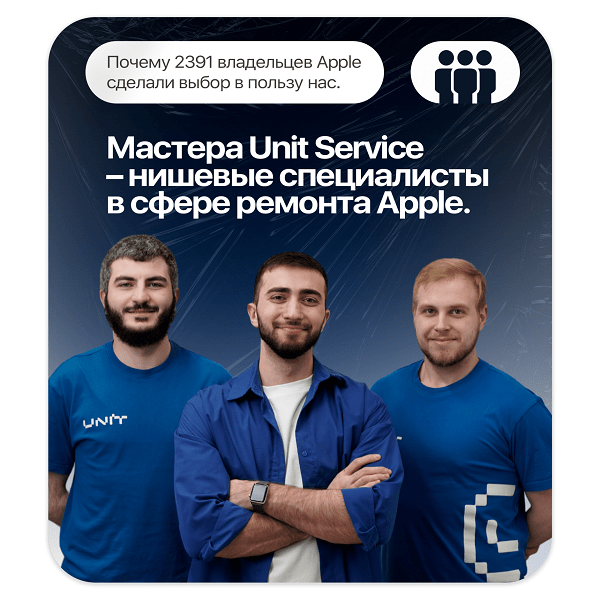 Unit Service – центр ремонта техники Apple, предоставляющий оригинальные комплектующие, гарантию до 1 года и поддержку в гарантийный период.